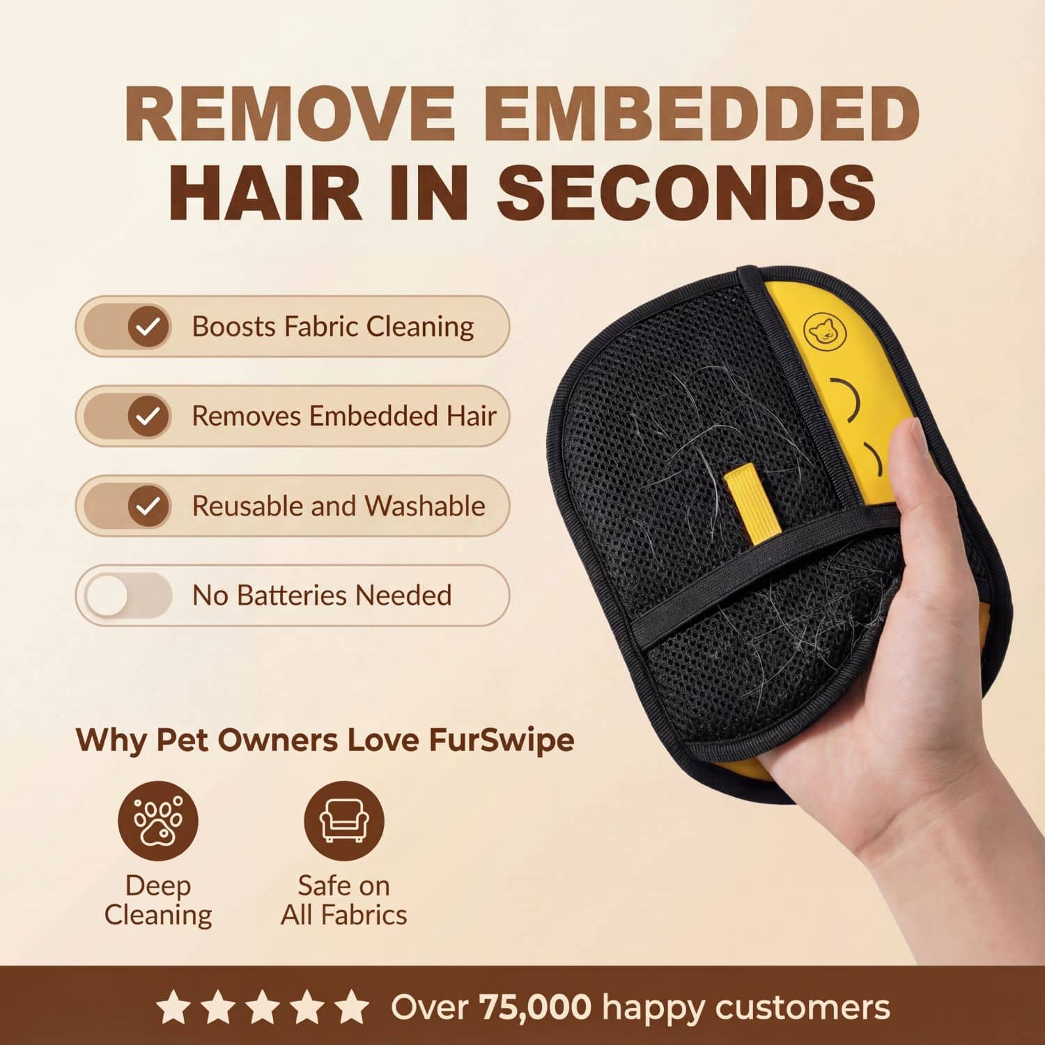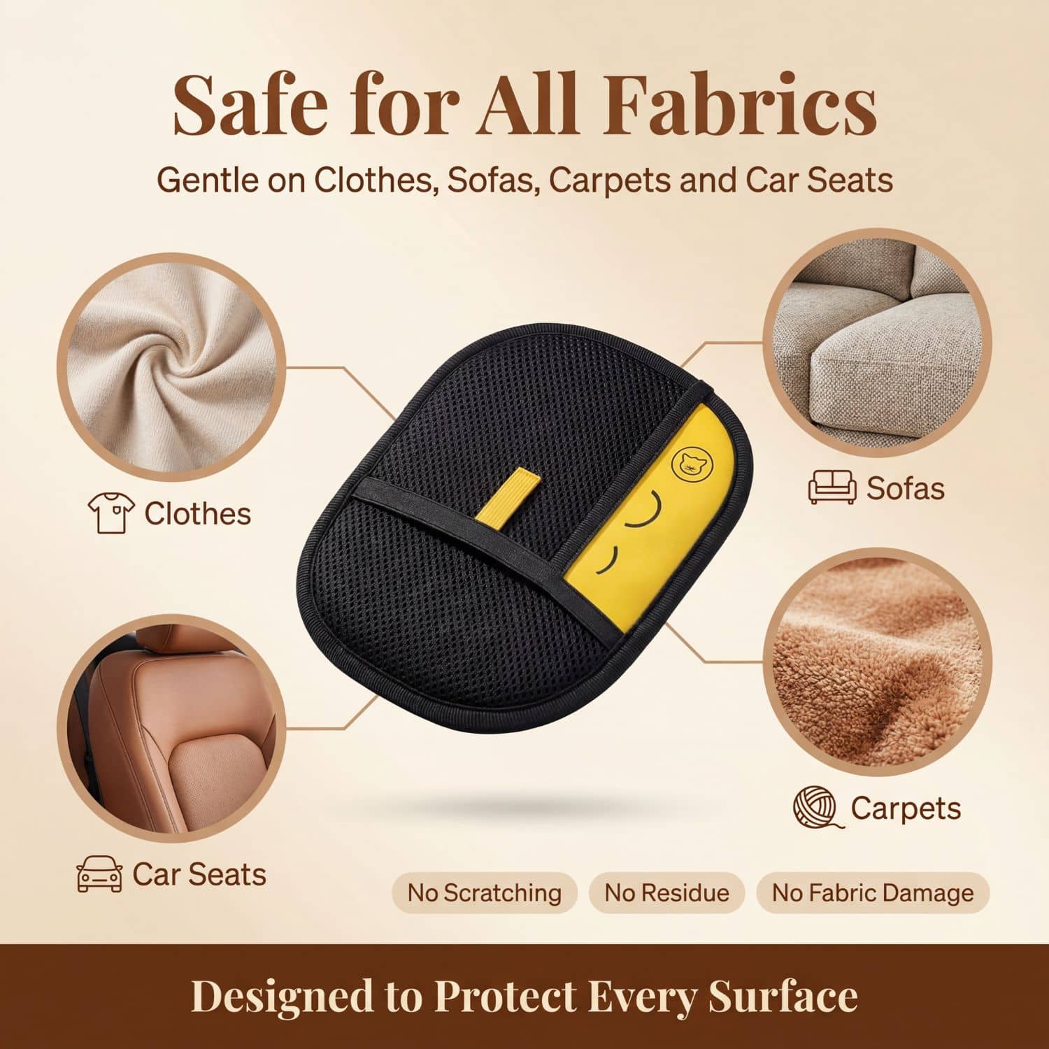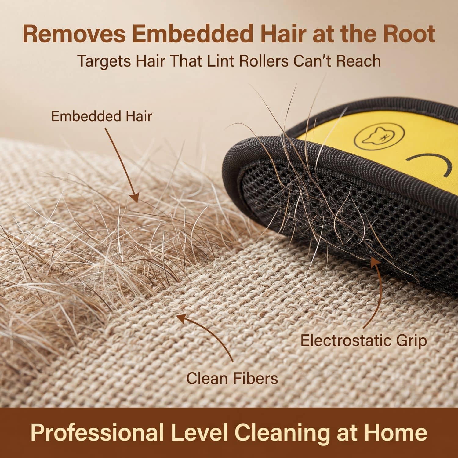 The glove lifts embedded pet hair in seconds on sofas, clothes, car seats, or directly on your pet.